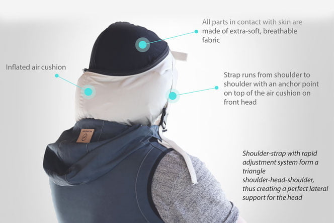 This traveling jacket is the perfect accessory for any wandering nomad. The original hood system supports the neck of the wearer – wherever they may be. The state-of-the-art outerwear enables you to sleep anywhere, even sitting upright in a moving vehicle.